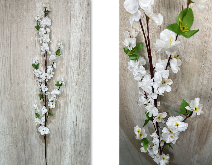 Galho Artificial de Flor de Cerejeira – Ref. 71039 Galho longo com flores brancas delicadas e folhagem verde. Ideal para