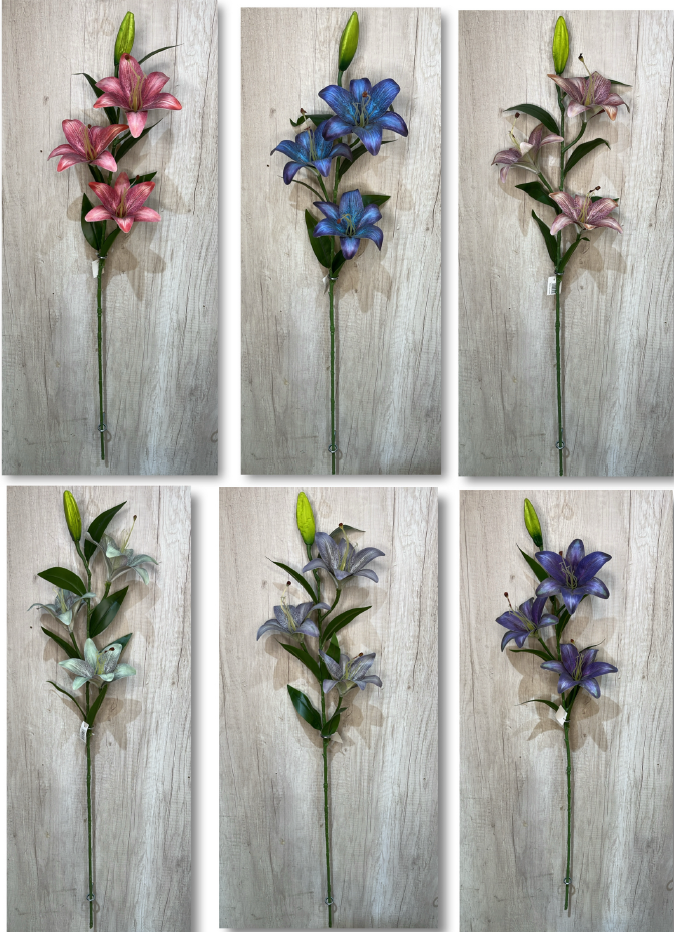 Galho Artificial de Lírios – Ref. 93160 Galho com flores grandes e realistas, pétalas com leve degradê e botão fechado n
