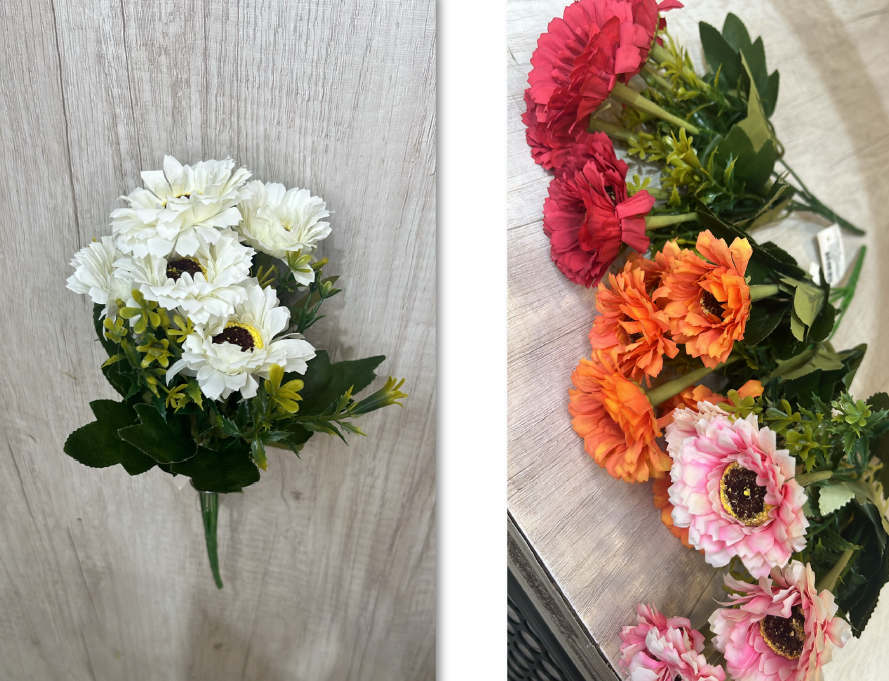 Buquê Artificial de Gérberas – Ref. 93047 Flores com pétalas vibrantes e folhagem verde. Cores: Branco, Vermelho, Laranj