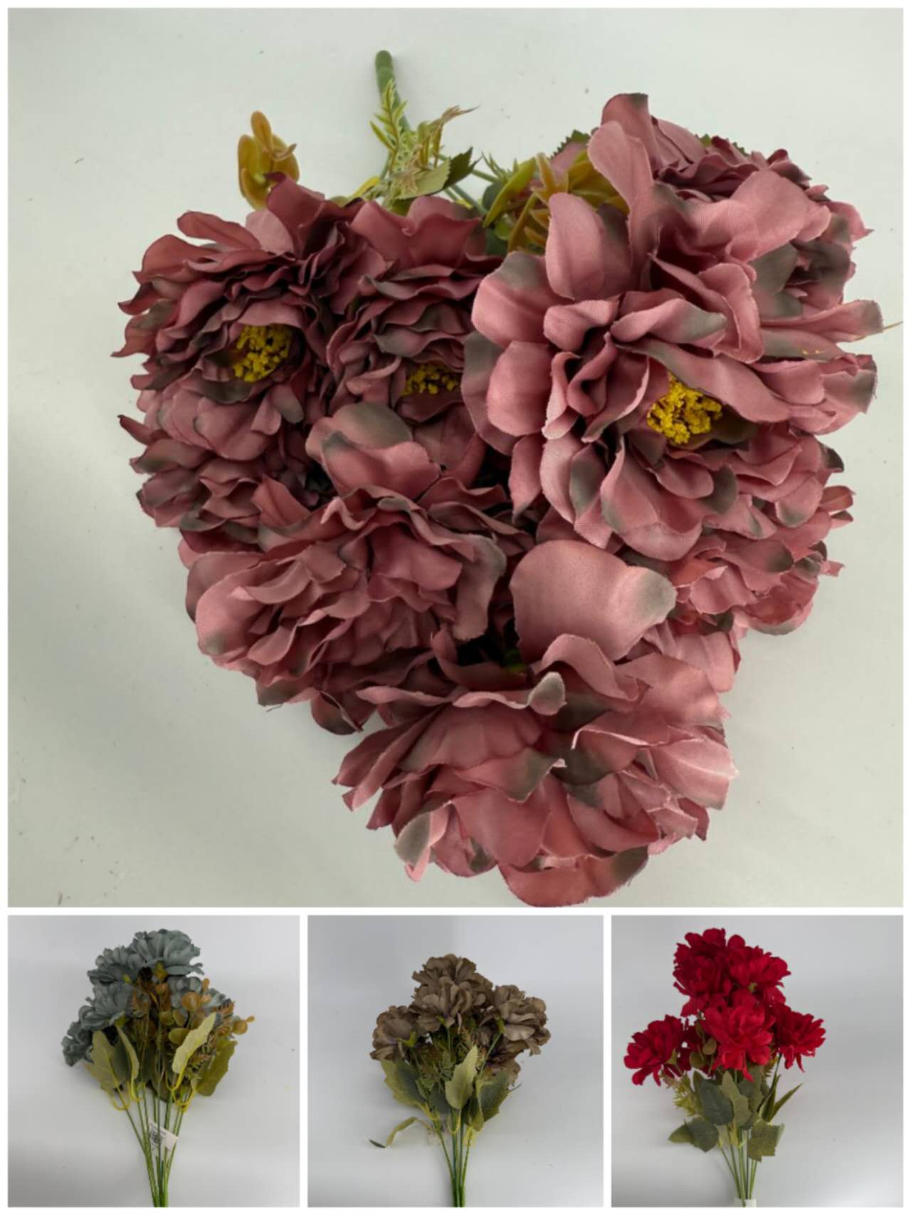 Buquê Artificial de Dália – Ref. 93067 Flores grandes e cheias, com pétalas em camadas e folhagem verde natural. Cores: