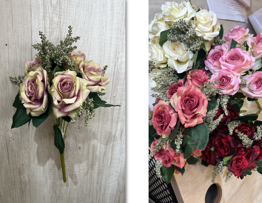 Buquê Artificial de Rosas – Ref. 780006 Flores com pétalas realistas e acabamento aveludado, acompanhadas de folhagem e